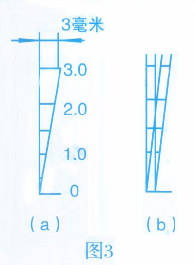 振幅指示牌如圖3(a)所示,只是部分為一直角三角形。當(dāng)指示牌與槽體一起振動是,由于視覺暫留,直角邊與斜邊形成一個交點,其交點所對應(yīng)的標(biāo)尺數(shù)即為被測槽體的雙振幅。當(dāng)雙振幅為2毫米時,交點就對應(yīng)在標(biāo)尺2處,如圖3 (b)所示。