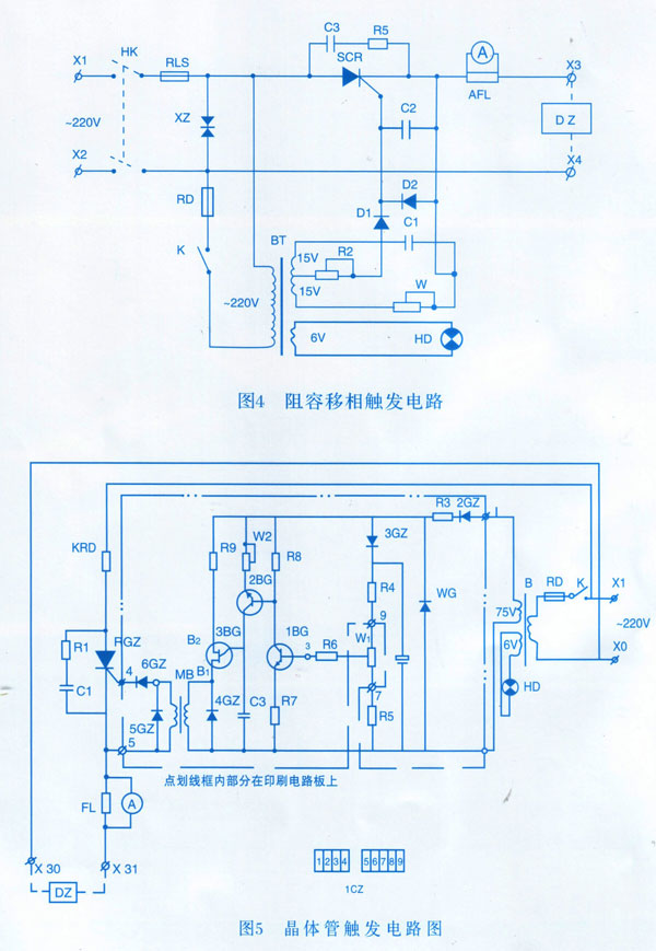 圖4所示為阻容移相角撥電路原理圖,圖5所示為晶體管觸發(fā)電路原理。其它如需各種 形式的自動控制電控箱,可按要求制作。